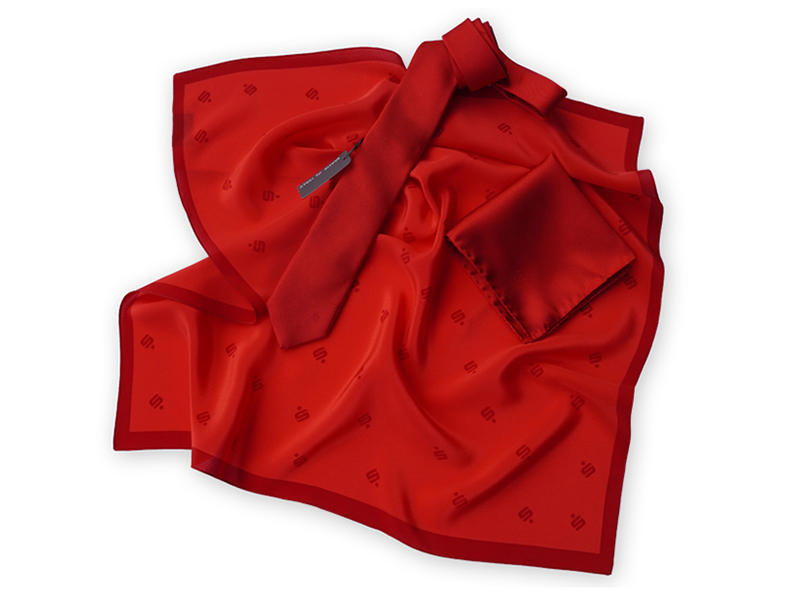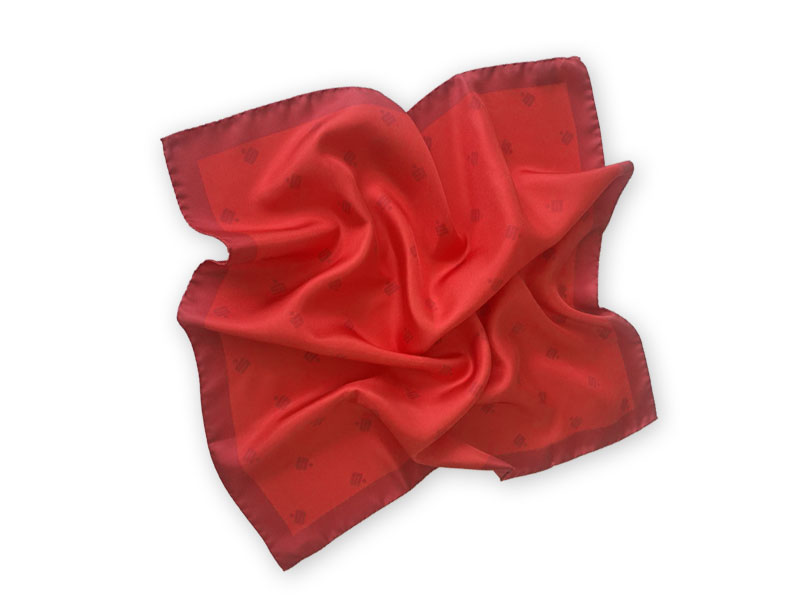 Sparkassen-Tücher aus Seidentwill sparkassenrot mit verstreut gedrucktem Sparkassen-S als Muster und einfarbigem Rand.