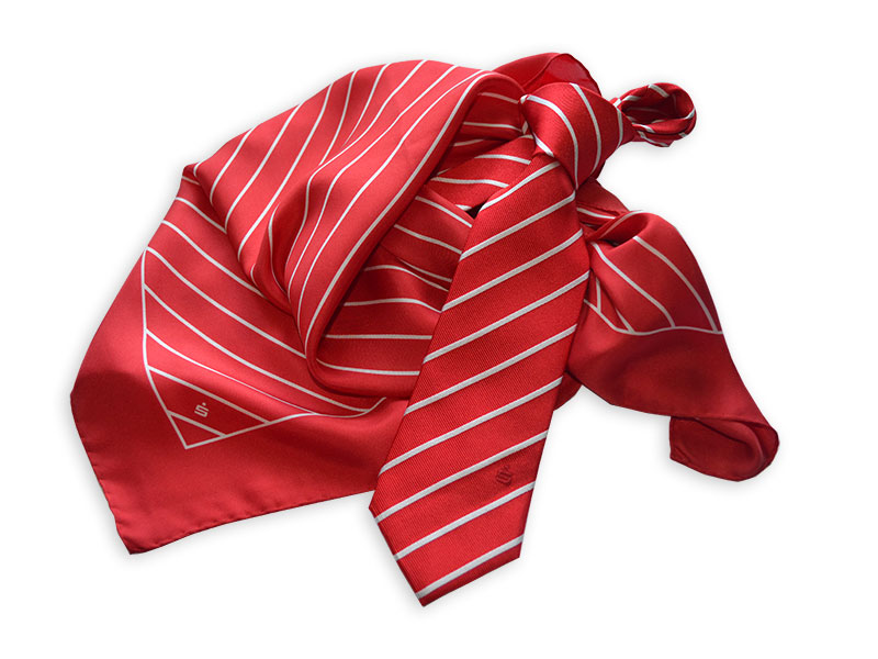 Dazu passend Tücher 80×80 cm und 90×90 cm, bedruckt in Sparkassen-Rot, edel verarbeitet mit rollierten Säumen, made in Como/Italien.