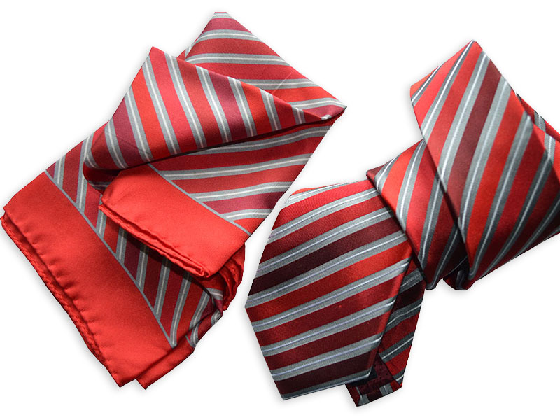 Gewobene Seidenkrawatte mit Tuch im identischen Streifendesign, hier auf Seidentwill gedruckt. Das Tuch kann auch auf andere als die hier abgebildete Qualität gedruckt werden (z.B. Bio-Baumwolle, Mischgewebe, Polyester-Microfaser), soweit diese von Stil und Stoffbreite geeignet sind.