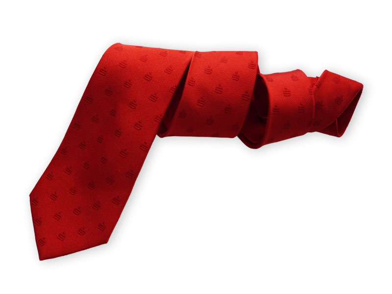 Sparkassenkrawatte mit Logo als Streumuster, Reine Seide, webgemustert in Farbe HKS 13, offene Spitzenverarbeitung beidseitig, Stegband aus Oberstoff, handvernäht.