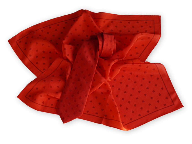 Dazu passend Tücher 55×55 cm, Tücher 70×70 cm und Schals 20×145 cm, Reine Seide bedruckt in Sparkassen-Rot mit kleinen Logos allover
