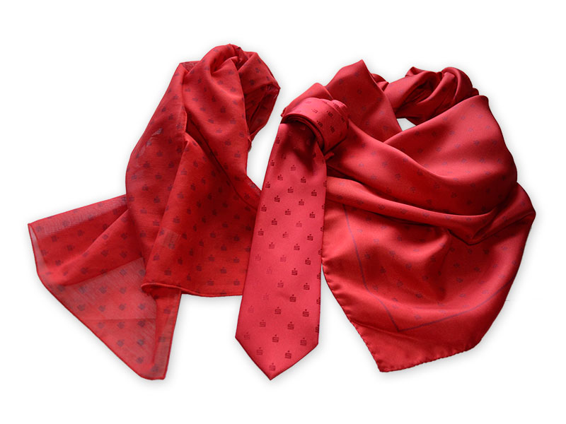Sparkassenkrawatten, webgemustert, HKS 13 glatt gewoben mit eingewebten Sparkassen-Logos als Streumuster, offene Spitzenverarbeitung beidseitig, Stegband aus Oberstoff, Premium-Futter, handvernäht in Como/Italien. Dazu passende Tücher 80×80 cm und Schal 33×180 cm, bedruckt mit Streumuster-Logos in Sparkassen-Rot, Öko-Tex-100 Standard made in Como/Italien.