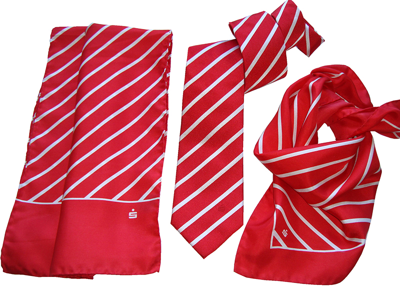 Sparkassenkrawatten Seide sparkassenrot gewoben mit Logo, HKS 13 mit weißem Streifen und platziert eingewebtem Logo, offene Spitzenverarbeitung beidseitig, Stegband aus Oberstoff, Premium-Futter, handvernäht in Como/Italien. Dazu passend Schals 30×140 cm sowie Tücher 55×55 cm und 90×90 cm, bedruckt in Sparkassen-Rot, Säume maschinenrolliert, made in Como/Italien.