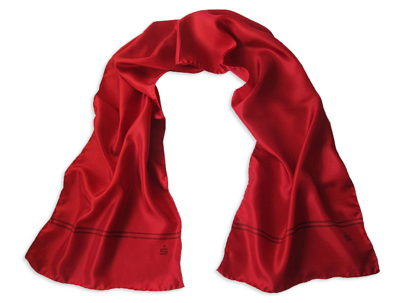 Schals 30×150 cm, Reine Seide, Twill, eingefärbt in Sparkassen-Rot, bedruckt mit Logo an beiden kurzen Seiten. Säume maschinenrolliert. Made in Como/Italien.